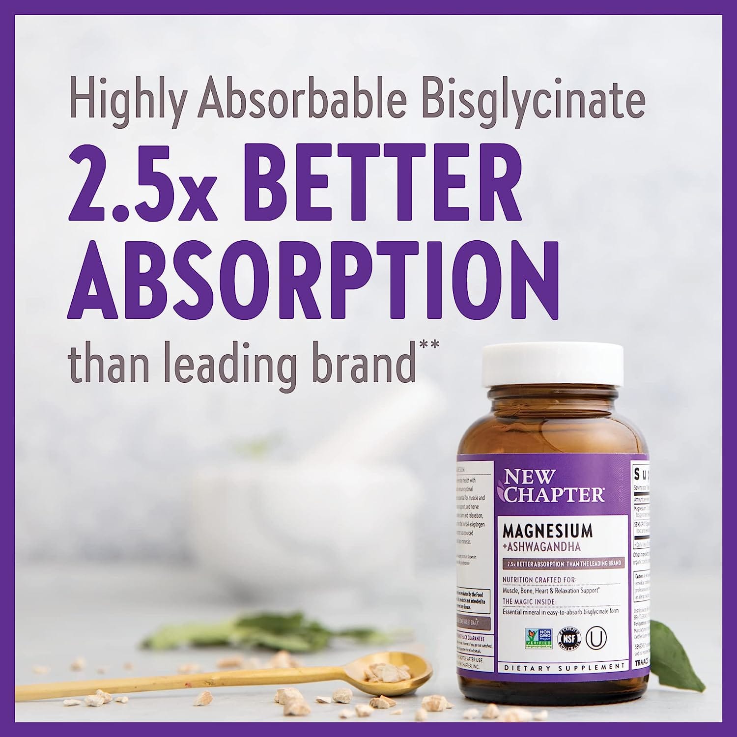 Exclusive Insights: The New Chapter Magnesium with Ashwagandha supplement stands out with its 2.5x better absorption compared to the leading brand, ensuring that your body receives the full benefits of this essential mineral. This highly bioavailable magnesium glycinate is gentle on the GI tract, making it a leading form of magnesium that supports not just muscle and bone health but also your heart and nervous system.