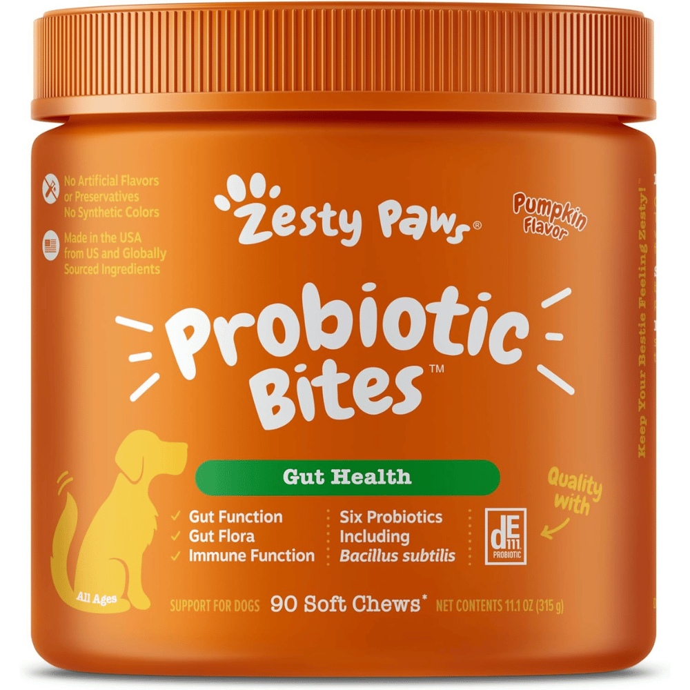 Zesty Paws' Probiotic Bites are soft chews that provide digestive and immune support with a blend of probiotics and prebiotics.