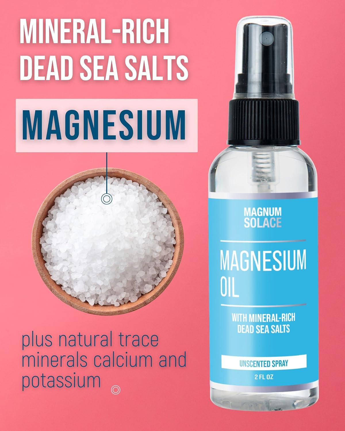 Magnum Solace Magnesium Oil Spray is a 100% natural magnesium spray that harnesses the power of Dead Sea Salt to deliver unmatched skin hydration and muscle relaxation. This magnesium spray is stronger than any magnesium lotion or cream, offering rapid absorption and a natural process that ensures your entire body benefits from the essential magnesium.